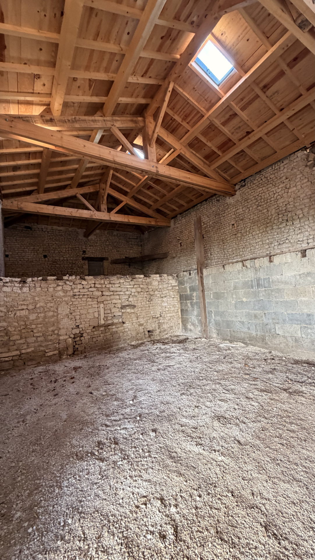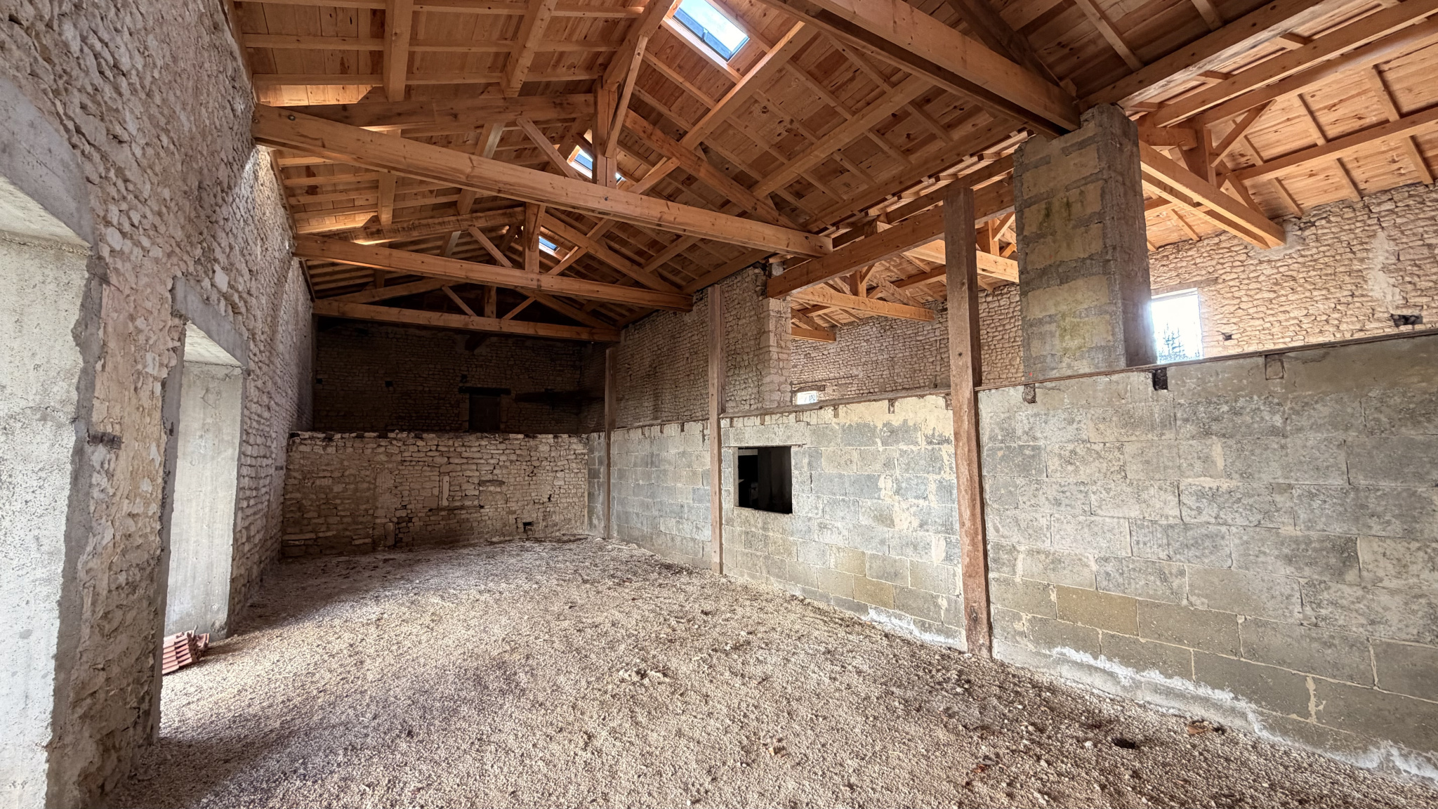 Grand loft au deuxième étage avec sa charpente apparente.