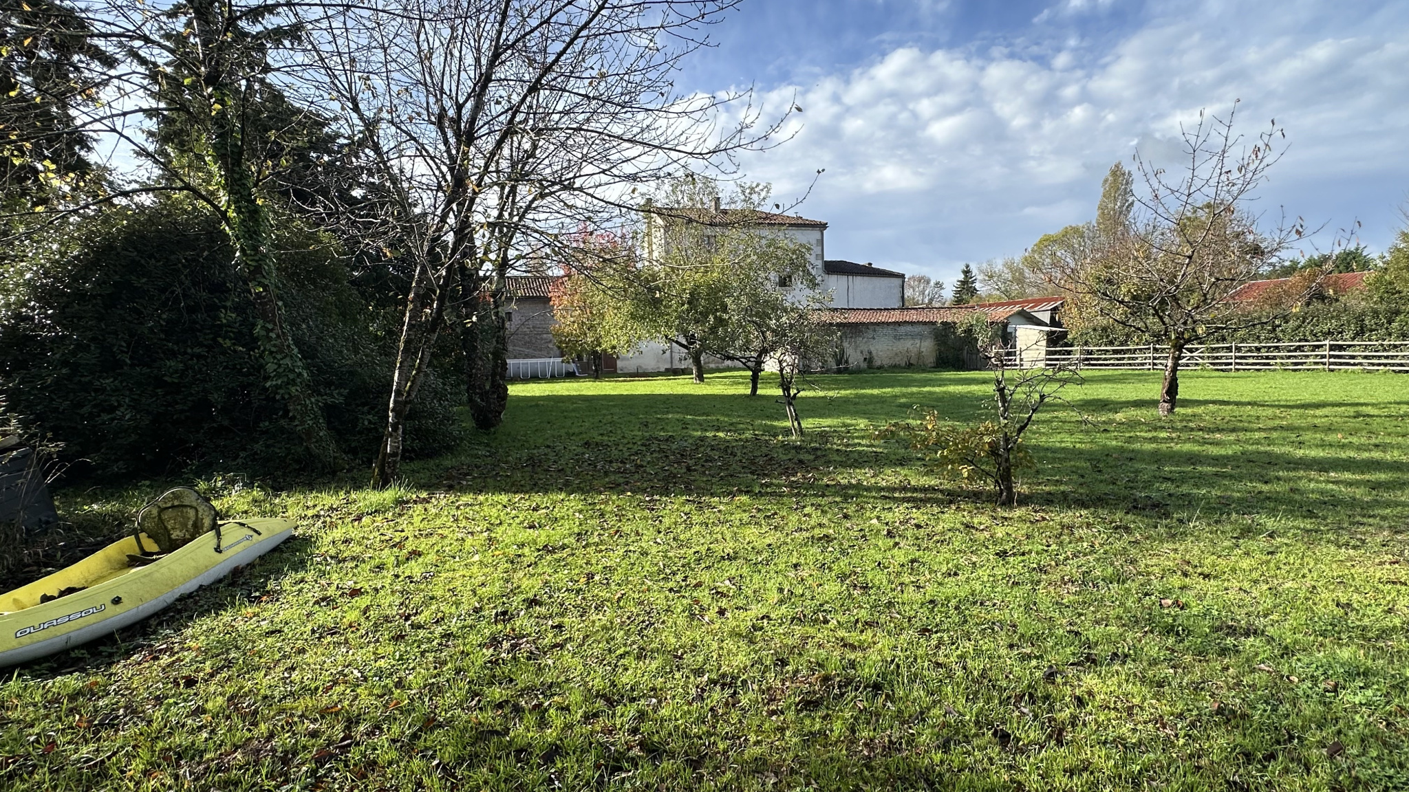 Jardin d'accueil sur l'avant avec des dépendances, sur l'arrière un large jardin ouvrant sur la campagne environnante.